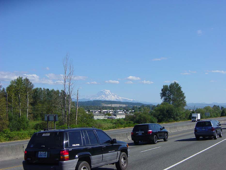 Mount Rainier, one of many views I had of the mountain today and over the course of the week. With the sun starting to go down behind me, the snow seemed to light up, making the mountain seem to jump right out of the scenery. Highway traffic looks thick here, but that's because just ahead there was a slowdown for some reason and everybody was stopping (including me). For about a mile or so after this I was passing all those stopped cars, safe and secure in my own private lane.