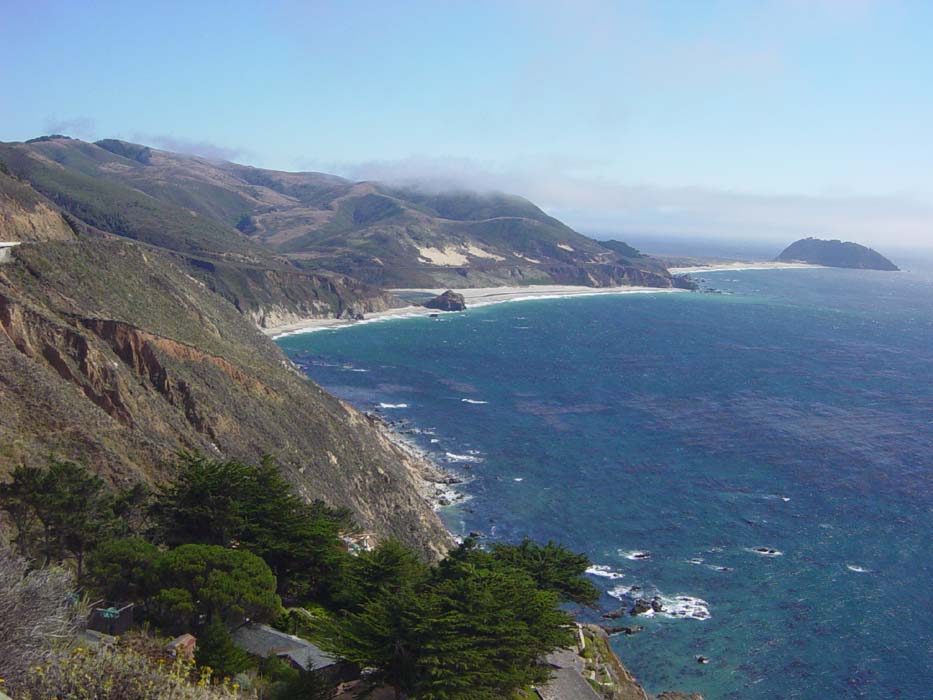 That concluded my tour of Monterey and Carmel, so I stopped for lunch (there are no fast food places here, only expensive restaurants where hamburgers cost $10 and you don't really want to know what a fountain drink costs). Once I paid the tourist tax, I moved on along Route 1, which was finally not a freeway anymore. Here's a picture of the early part of the route, where some fog has come in briefly, but you can see the blue sky past it.