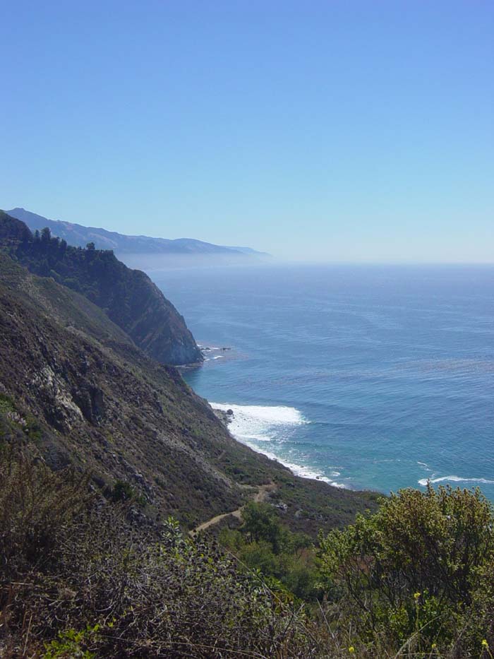 I wish him luck, he's got his work cut out for him hiking for miles uphill into the wilderness, but he looked like the sort who can pull it off. Of course, I had my own trial to endure today so I set off, unfortunately a bit later than I wanted to, a little after 11am. (I slept too long, or should I say, I huddled under the sleeping bag shivering too long.) Then I had to endure a grueling 3-mile climb out of Big Sur back to the coast. Here's what the view looked like at the top of that climb: