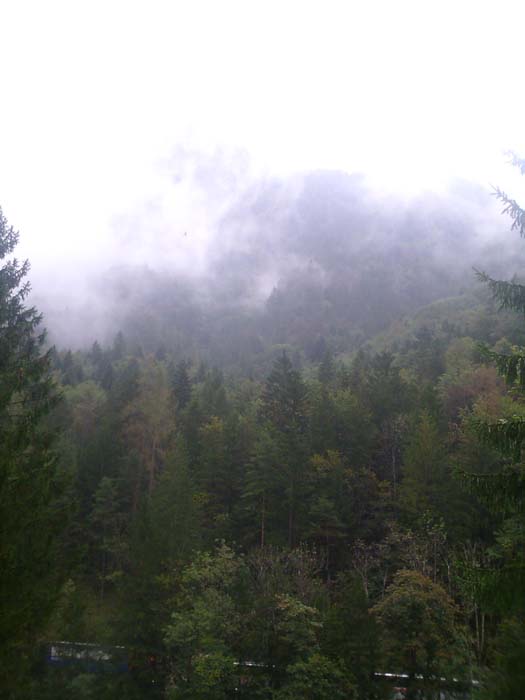 Anyway, after getting breakfast (I stuck with the cold cereal again, since it seems to be working) we set off a little after 10 and headed out of the hotel into the cold and damp. Here, let me share a couple pictures of the area around us so you can compare with yesterday's much better photos. At least the clouds hanging over the mountains were kind of neat.