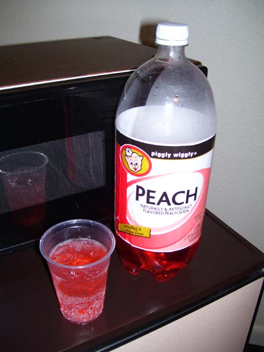 A few miles later I came to a tiny hotel on the edge of town, fortunately with a pizza place next door and grocery store not much farther. I've made it a habit to buy a pizza (or pasta) every night, along with a 2-liter of soda that hopefully doesn't have any caffeine. Usually I go for creme soda or lemon-lime stuff or maybe root beer, but tonight I saw something different...peach soda. Well, I'm in Georgia, right? So I tried some, and it's pretty good.