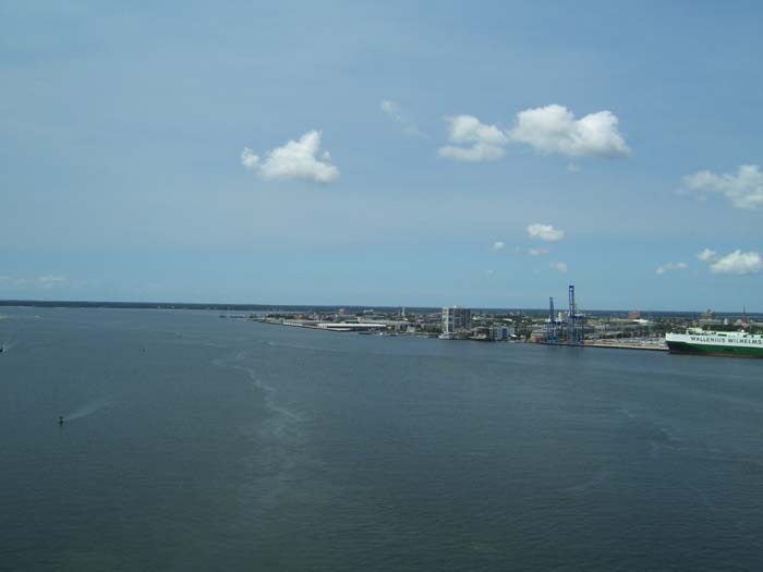 Anyway, after getting the tire fixed and grumbling about how I never would've had that flat at all if the liner would've been there, I packed up and left just before 11. A couple miles down the road I found a bike shop and bought some tire liners (which I'll put in after my next inevitable flat) and topped off my air. Then I headed into downtown Charleston, worked my way around to the pedestrian access ramp to the bridge, and that's when I got a real good look at what I had to climb: