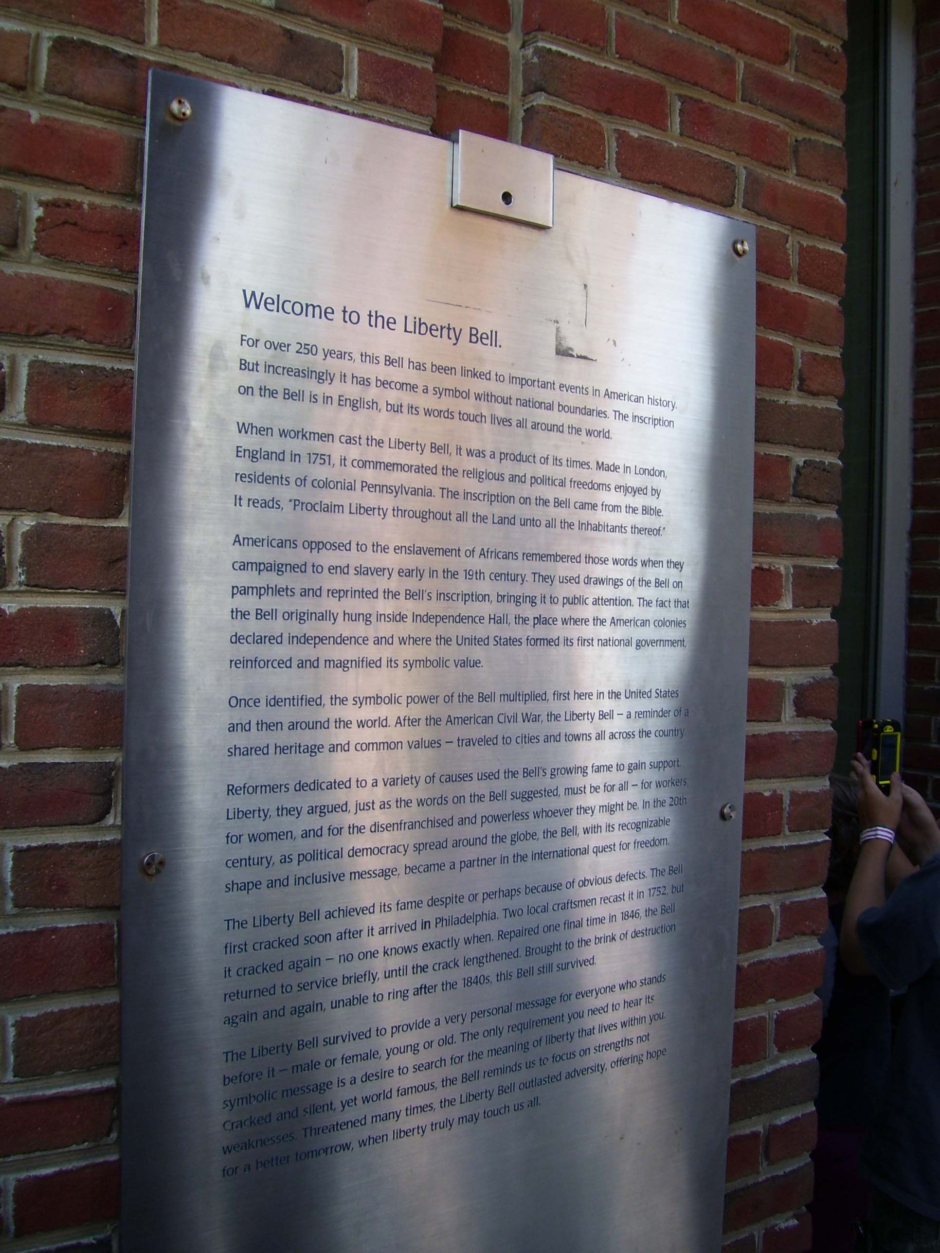 Finally, I got to the Liberty Bell, which used to be in Independence Hall but is now kept in a nearby climate-controlled building. The line to get inside was 45 minutes long, so I didn't bother, since they had a viewing window outside. Here's the plaque on the nearby wall (click for larger, readable view).
