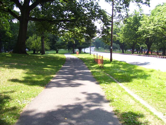 Once through that, the urban terrain gave way to ordinary streets, by which point I'd left New York City behind. I even found a nice private bike path for a few miles, in among the trees where it was cool.