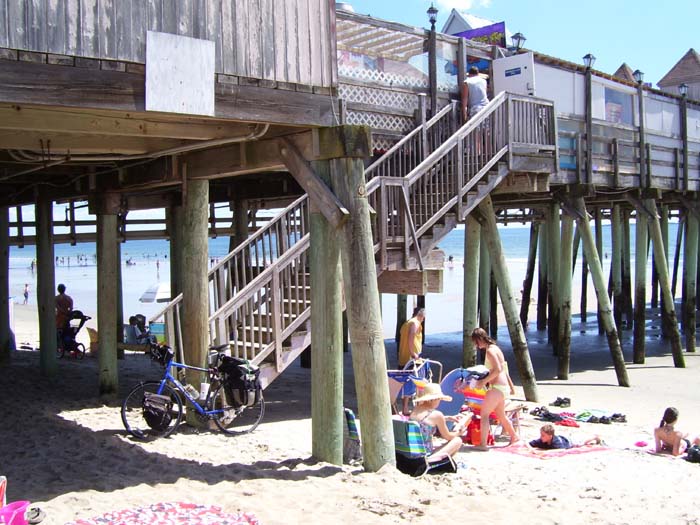 The pier itself is completely framed by businesses, like pizza joints and T-shirt shops, plus a bar down at the end. They wouldn't even let me walk my bike up there, so I just snapped this picture from the nearby beach and moved on.