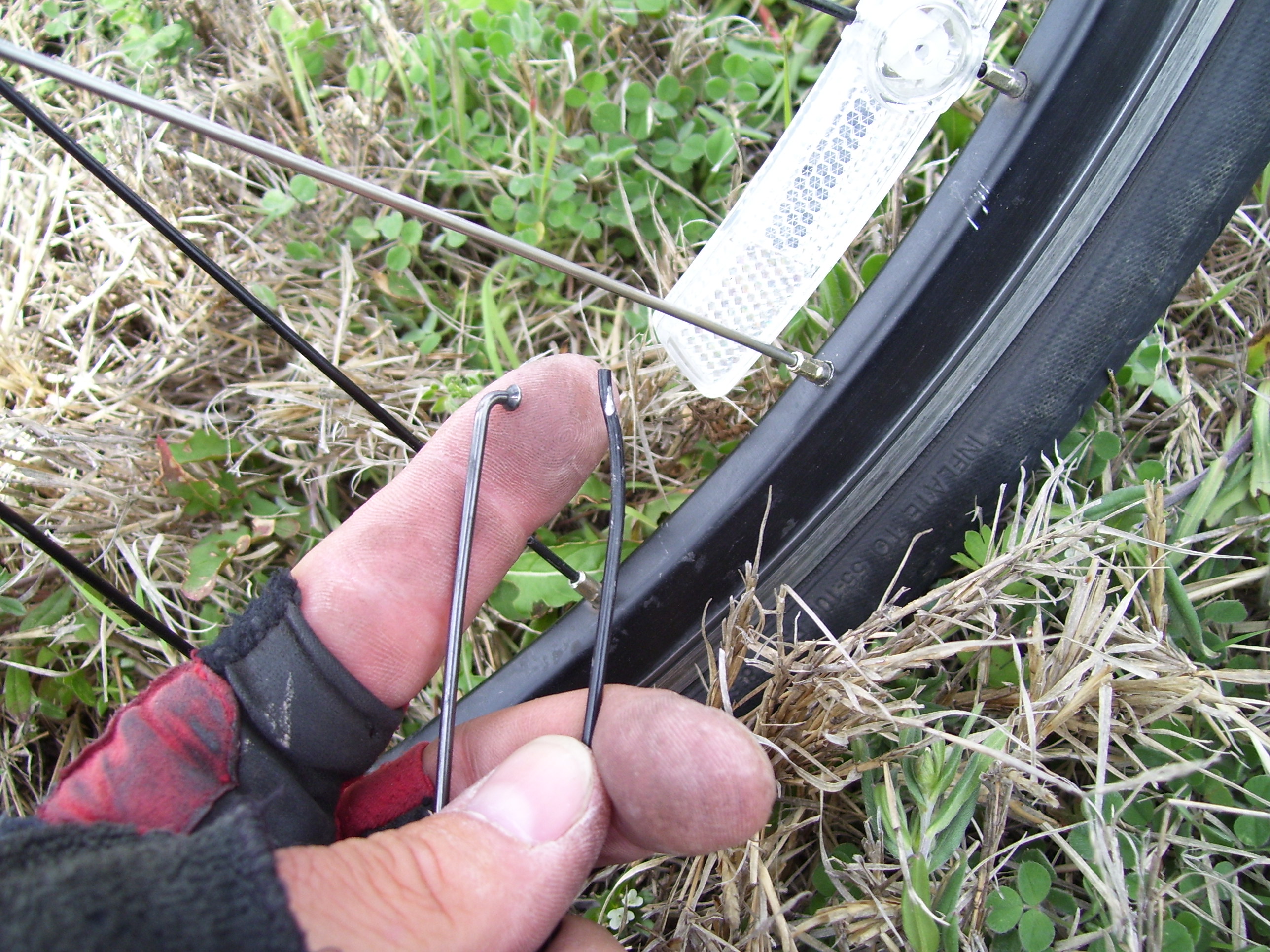 Shortly after leaving the rest area I heard a loud pop from the front of my bike and quickly slammed on the brakes. Fearing the worst, I inspected the tire, but found no damage and it was still holding air. Neither of the panniers were broken, either. Then I tried spinning the wheel and it instantly hit the brake pad, which told me at once what had happened: a broken spoke.