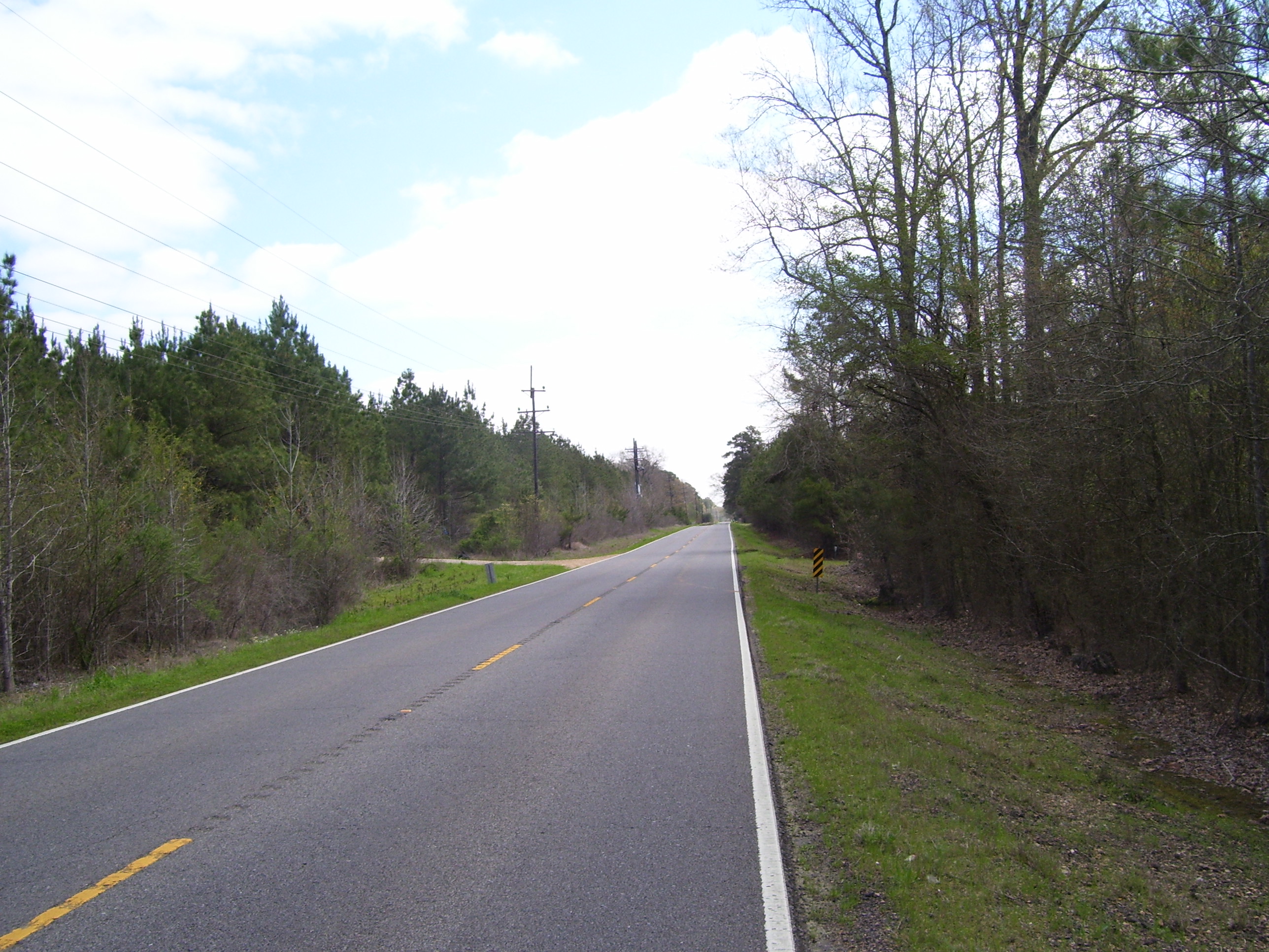 The supposed scenic route didn't work out quite like I hoped, just taking me off into forested areas on a two-lane road that looked something like this for most of the time. Not too horrible, really, since traffic was light, and the trees blocked the wind. The winds today came out of the south or southeast, and since my route wandered around quite a bit, it was a toss-up whether I'd have a tailwind, crosswind or headwind. It worked out to be about an even amount of each, the headwinds mostly waiting for the end of the day.
