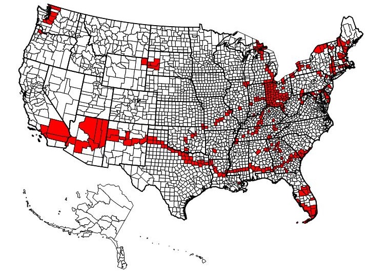 I had a secret goal on this trip (not mentioned on any of the other pages, because the muggles wouldn't understand) to find a cache in just about every county I visited, such that I created a continuous line stretching from coast to coast. I'm happy to say I succeeded, and here's a look at my county finds map from the day I finished the trip. Some of those counties in the west are really huge, but the further east I went, the smaller they got. In fact, in Georgia some of them were only a few miles across, making it very difficult to complete my mission. There are a couple of occasions on the tour where I mention "side trips" which were, in fact, detours to grab a single cache in that county just to keep the line going.