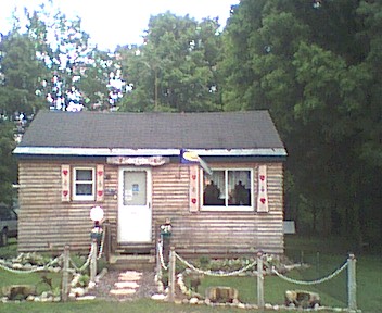 Unfortunately, the wind decided to shift and come out of the east, and the going got much tougher. My legs, which had felt OK after the break, began to get tired quickly. Then it started to rain again, and I decided if I saw anyplace to stop for the day, I'd take it. I found a likely target at Hulbert, where I spotted a motel at the top of a tough hill. Though I doubted it would have cable (the area is pretty remote), I was ready to quit, so I did. This turned out to be my best decision yet. Here's a photo of the Hulbert Hills Motel office, so you can get an idea of how things looked before I go on. (Note: The actual hotel rooms are off to the right. I wasn't actually going to be staying in this little building.)