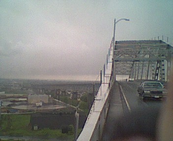 Once I finally got to the other side, I discovered that this was actually a double bridge, with the first section ending on an island. This was where the toll booth was. There was no fee for bikes, so I cruised on, but now I had to cross a really steep section of bridge, with no concrete path to fall back on if things went wrong. Worse, as I went up, I discovered there were sections of the bridge with gratings in it wide enough to annihilate my tires (sort of like those sewer grates with grooves parallel to the road, only these stretched all the way across, with no way to evade them). I was forced to stop, leaning against the guardrail, until there were no cars coming in either direction. At that point I could safely ride on, crossing both lanes at an angle so my tires didn't fall into the grooves. I had to do this twice. I'm just lucky I saw these bike-killers in time to stop, or I could have been in a serious accident.